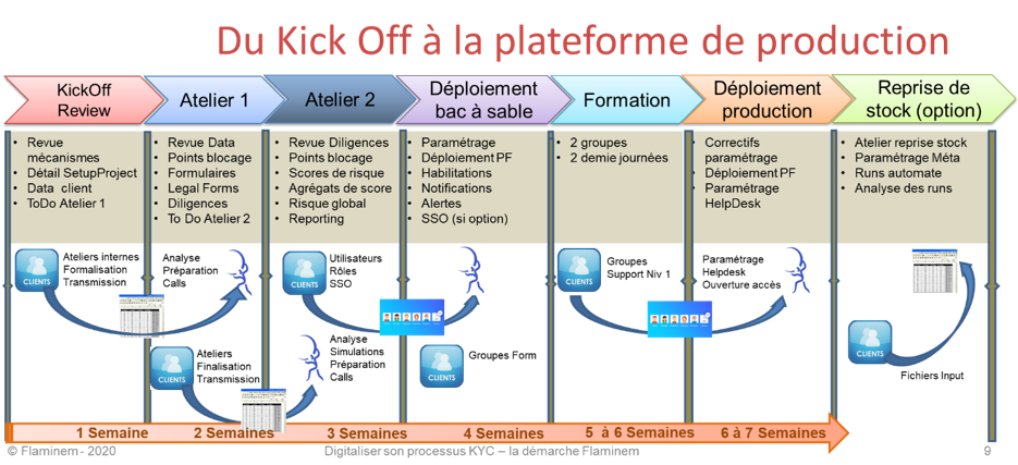 Fort de son expérience avec de nombreux clients, Flaminem a mis au point une démarche pour sécuriser le projet de digitalisation KYC, de son démarrage jusqu’à son déploiement.