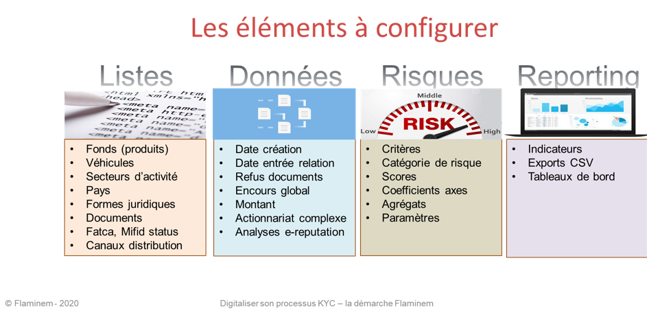 - Les produits et opérations, les canaux d’entrée en relation, le filtrage pour la e-réputation (PEP, sanctions, média) qu’on peut moduler par rapport à son analyse.